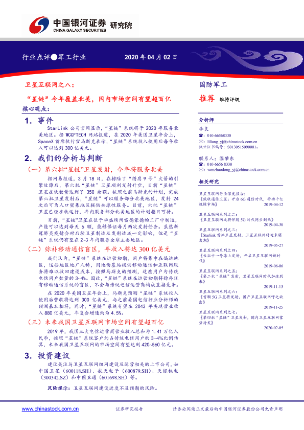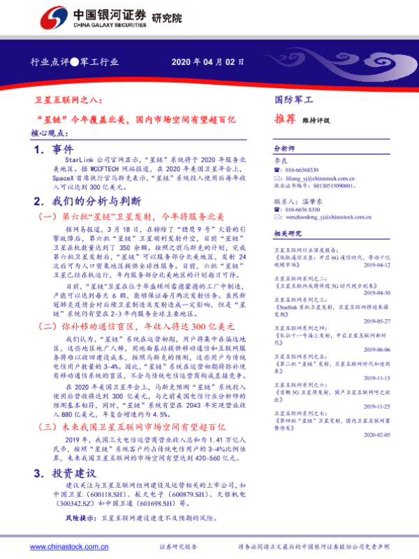 【银河证券】【20200402】卫星互联网之八:“星链”今年覆盖北美,国内市场空间有望超百亿-3页