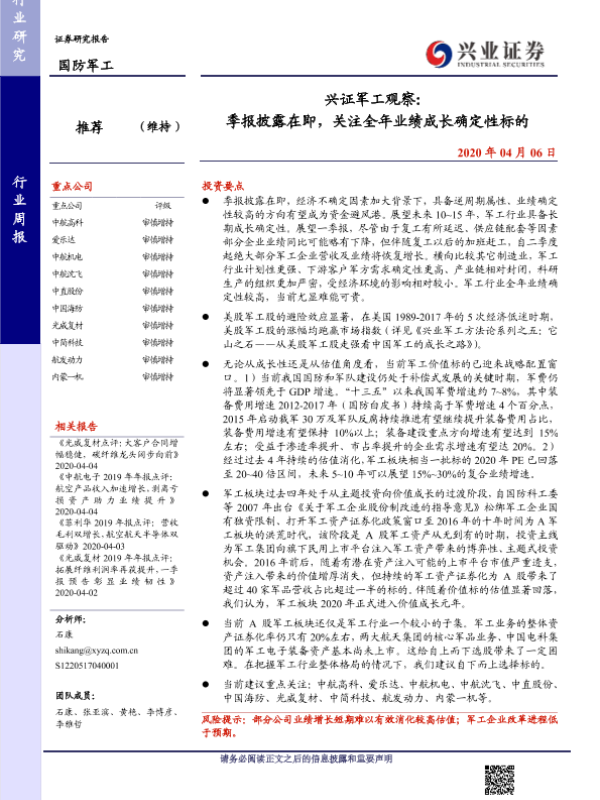 【兴业证券】【20200406】兴证军工观察:季报披露在即,关注全年业绩成长确定性标的-15页