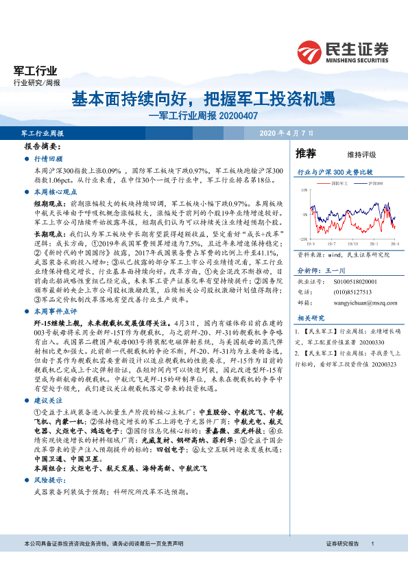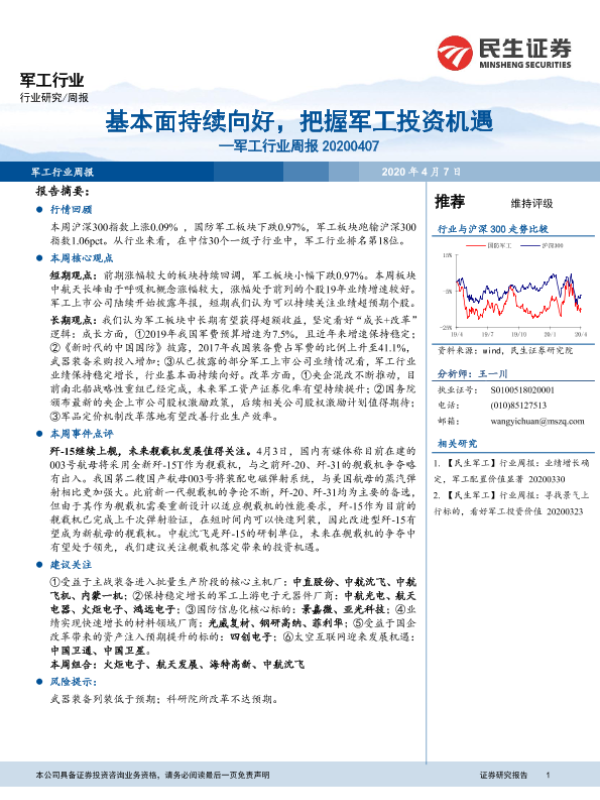 【民生证券】【20200407】20200407-民生证券-军工行业周报:基本面持续向好,把握军工投资机遇-45页