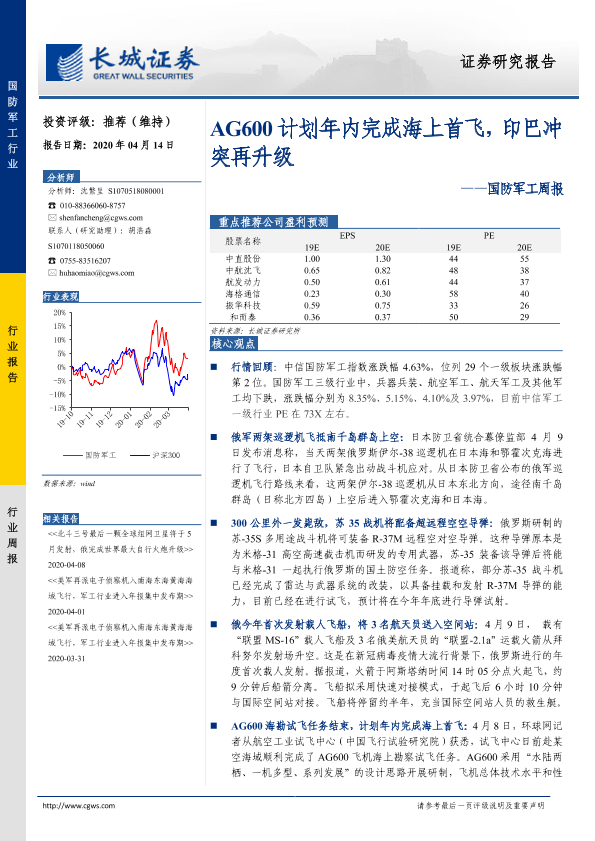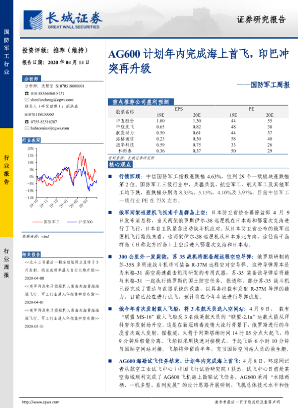 【长城证券】【20200414】20200414-长城证券-国防军工周报:AG600计划年内完成海上首飞,印巴冲突再升级-12页