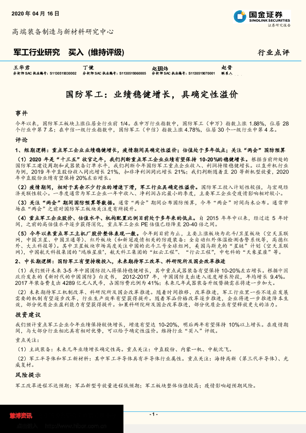 【国金证券】【20200416】国防军工:业绩稳健增长,具确定性溢价-3页