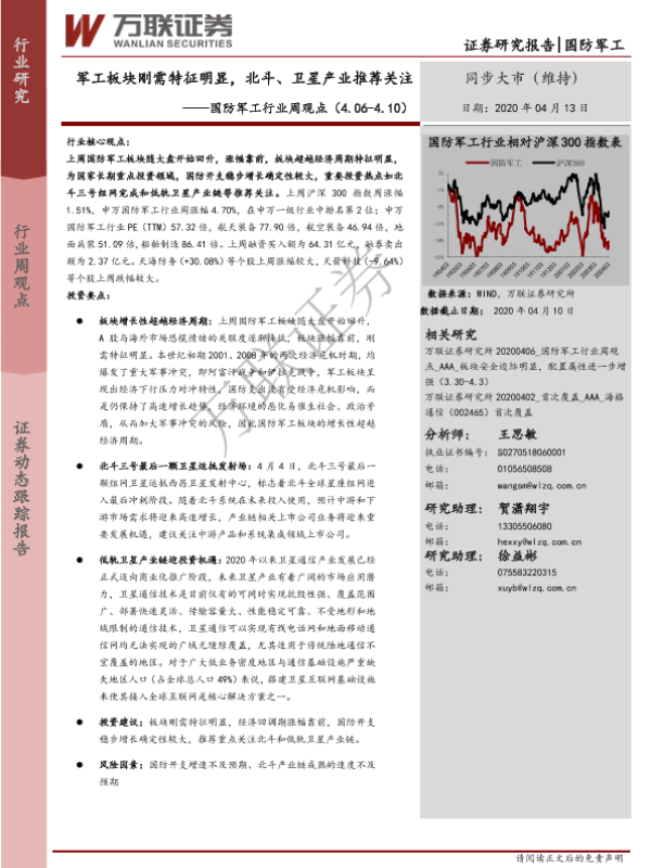 【万联证券】【20200413】20200413-万联证券-国防军工行业周观点:军工板块刚需特征明显,北斗、卫星产业推荐关注-11页