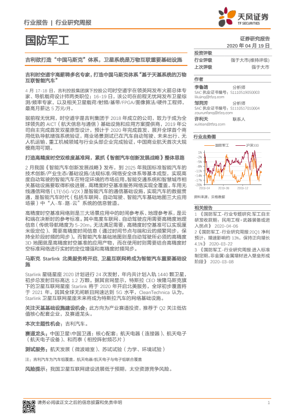 【天风证券】【20200419】国防军工行业研究周报:吉利欲打造“中国马斯克”体系,卫星系统是万物互联重要基础设施-3页