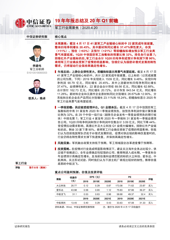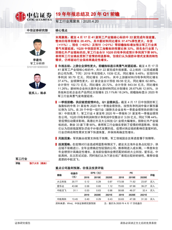 【中信证券】【20200420】20200420-中信证券-军工行业周聚焦:19年年报总结及20年Q1前瞻-12页
