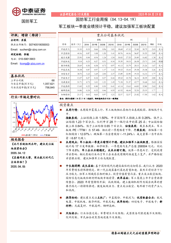 【中泰证券】【20200419】20200419-中泰证券-国防军工行业周报:军工板块一季度业绩预计平稳,建议加强军工板块配置-19页