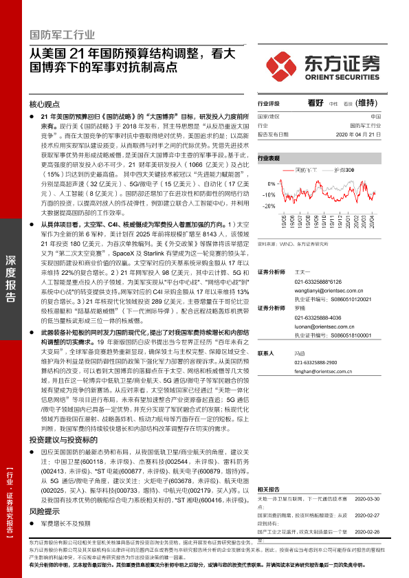 【东方证券】【20200421】国防军工行业:从美国21年国防预算结构调整,看大国博弈下的军事对抗制高点-24页