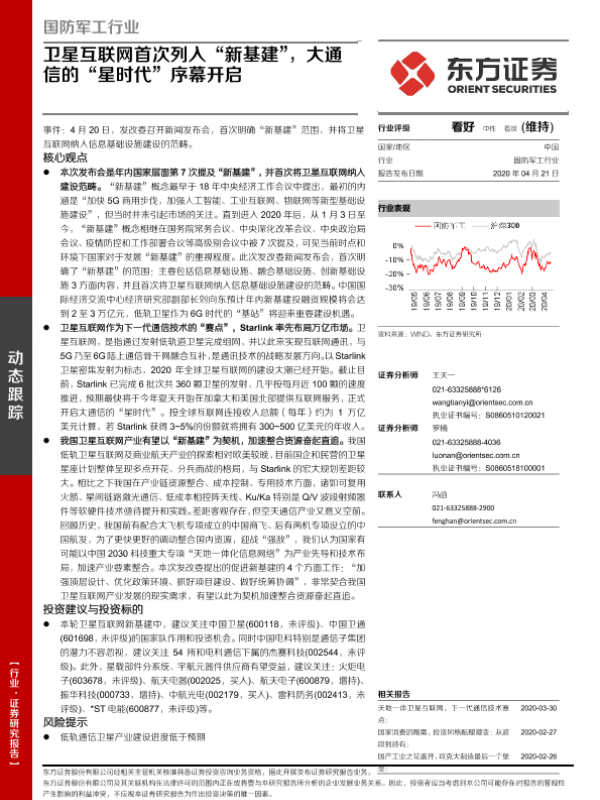 【东方证券】【20200421】国防军工行业:卫星互联网首次列入“新基建”,大通信的“星时代”序幕开启-3页