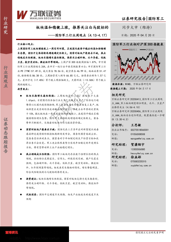 【万联证券】【20200420】20200420-万联证券-国防军工行业周观点:板块温和稳健上涨,推荐关注白马股标的-13页