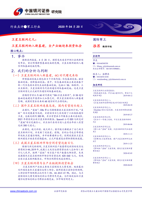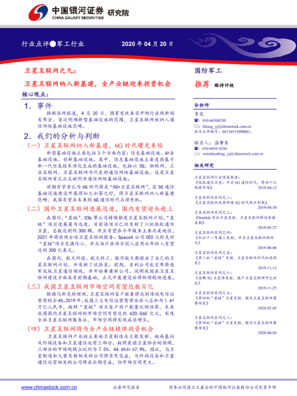 【银河证券】【20200420】卫星互联网之九:卫星互联网纳入新基建,全产业链迎来投资机会-4页