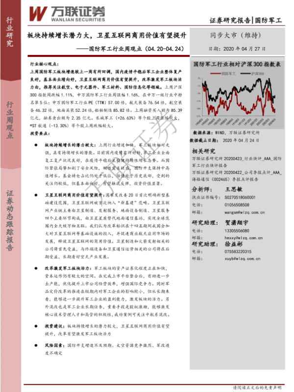 【万联证券】【20200427】20200427-万联证券-国防军工行业周观点:板块持续增长潜力大,卫星互联网商用价值有望提升-19页