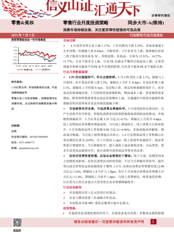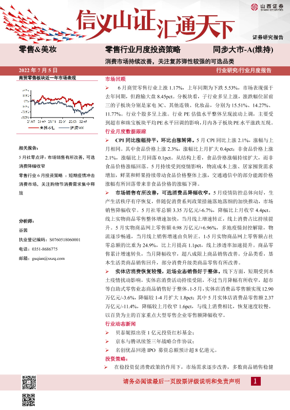 【山西证券】【20220705】零售行业月度投资策略:消费市场持续改善,关注复苏弹性较强的可选品类-18页