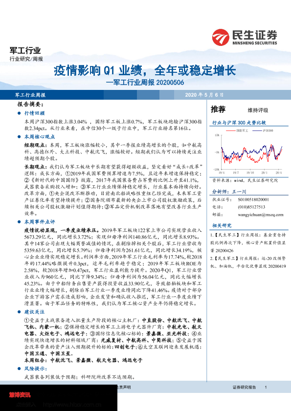 【民生证券】【20200506】20200506-民生证券-军工行业周报:疫情影响Q1业绩,全年或稳定增长-47页