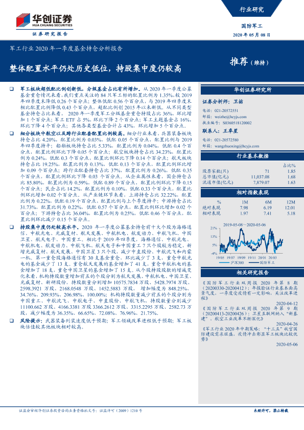 【华创证券】【20200508】军工行业2020年一季度基金持仓分析报告:整体配置水平仍处历史低位,持股集中度仍较高-14页