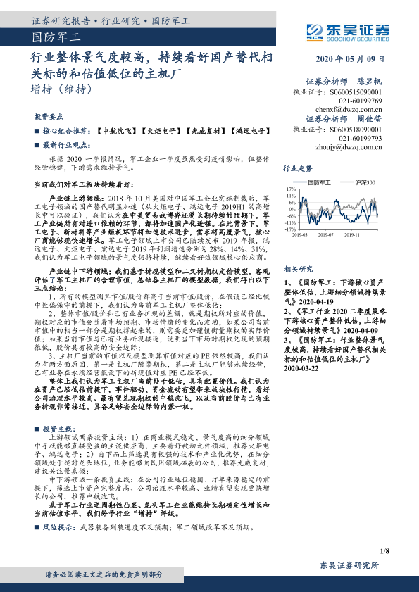 【东吴证券】【20200509】国防军工:行业整体景气度较高,持续看好国产替代相关标的和估值低位的主机厂-8页