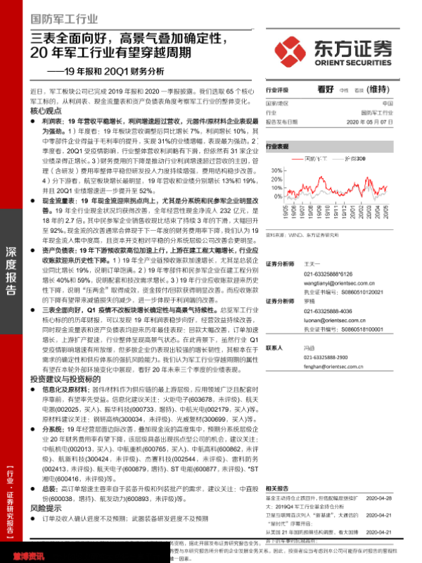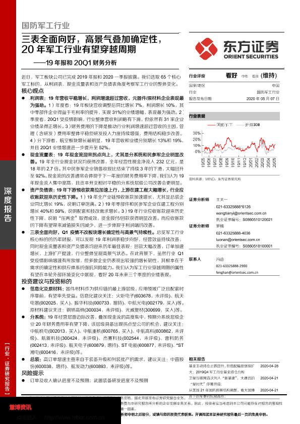 【东方证券】【20200507】国防军工行业19年报和20Q1财务分析:三表全面向好,高景气叠加确定性,20年军工行业有望穿越周期-25页