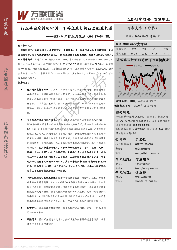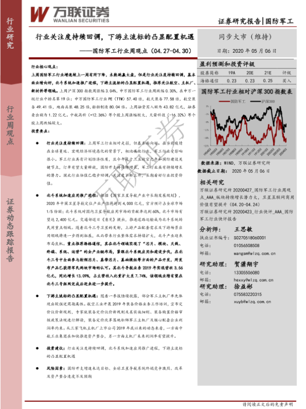 【万联证券】【20200506】20200506-万联证券-国防军工行业周观点:行业关注度持续回调,下游主流标的凸显配置机遇-12页