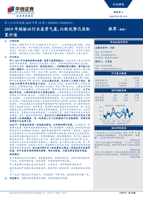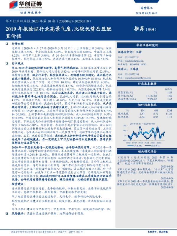 【华创证券】【20200510】20200510-华创证券-军工行业双周报2020年第10期:2019年报验证行业高景气度,比较优势凸显配置价值-27页