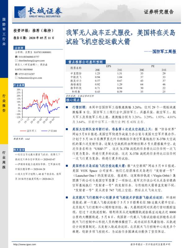【长城证券】【20200511】20200511-长城证券-国防军工周报:我军无人战车正式服役,美国将在关岛试验飞机空投运载火箭-13页