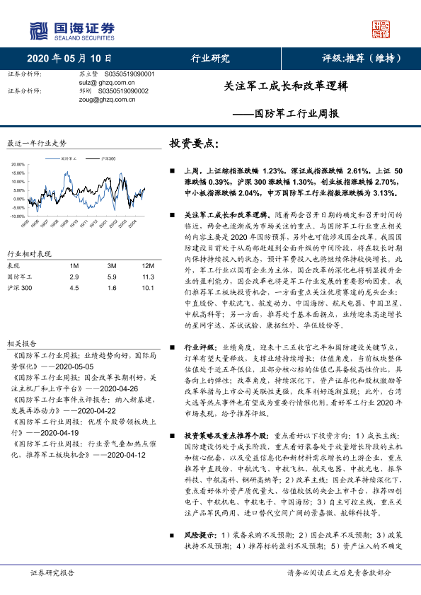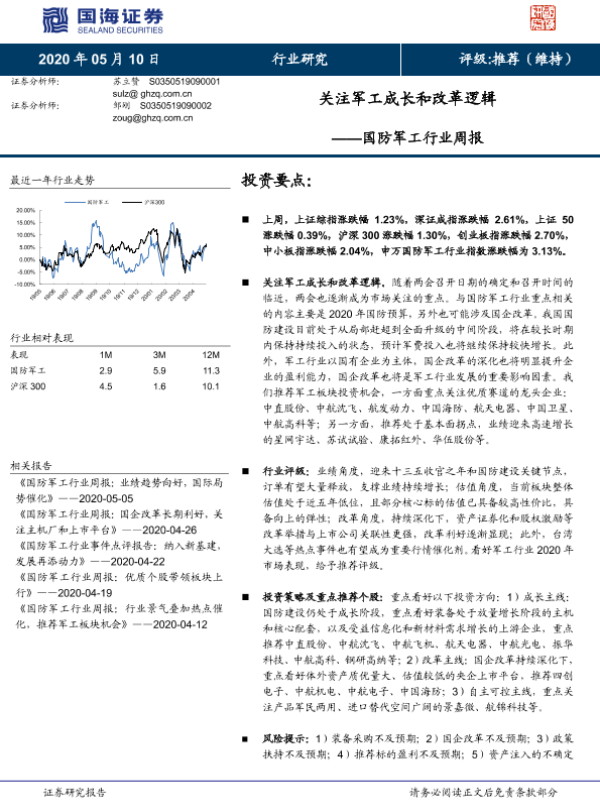 【国海证券】【20200510】国防军工行业周报:关注军工成长和改革逻辑-13页