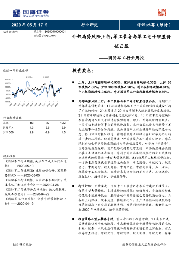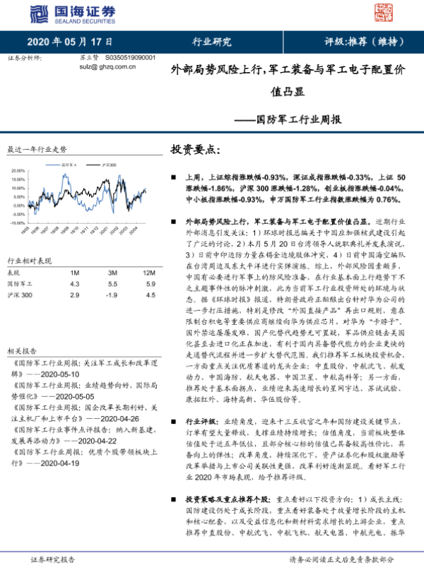 【国海证券】【20200517】国防军工行业周报:外部局势风险上行,军工装备与军工电子配置价值凸显-13页