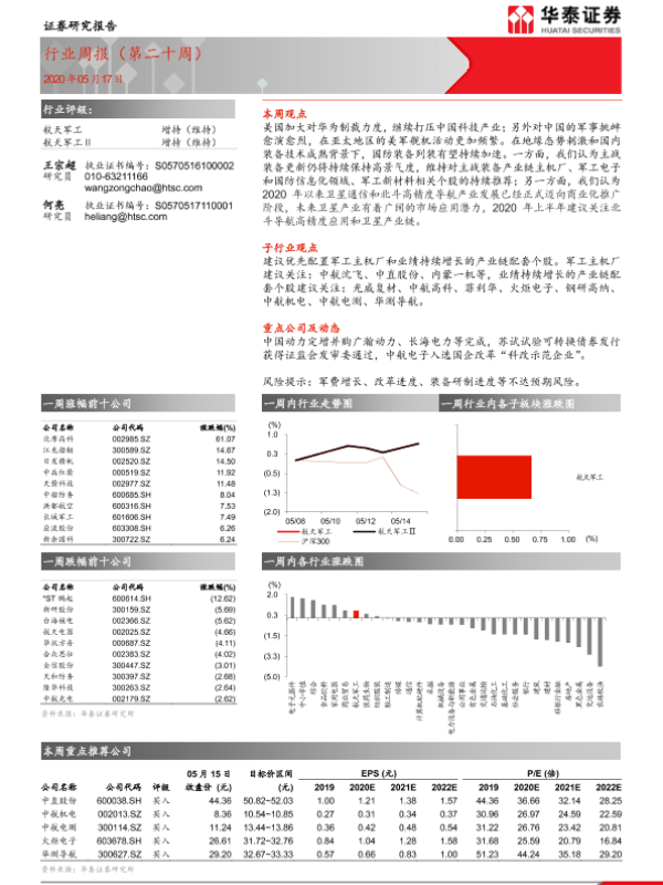 【华泰证券】【20200517】20200517-华泰证券-航天军工行业周报(第二十周)-16页