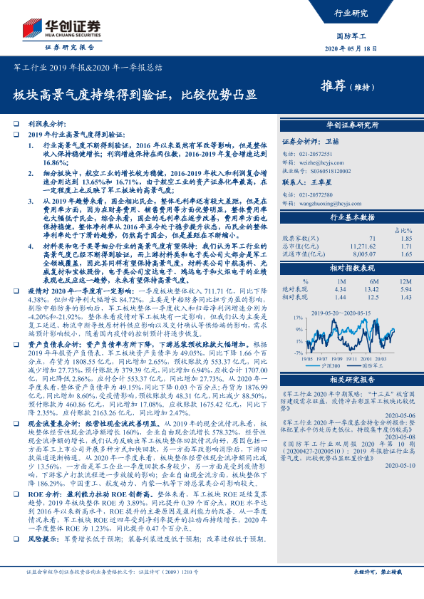 【华创证券】【20200518】军工行业2019年报&2020年一季报总结:板块高景气度持续得到验证,比较优势凸显-26页