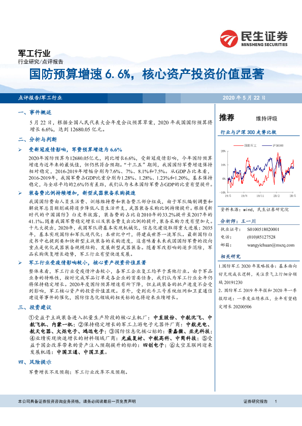 【民生证券】【20200522】军工行业:国防预算增速6.6%,核心资产投资价值显著-4页