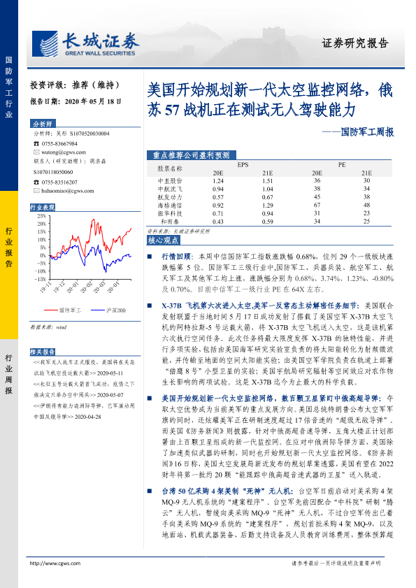 【长城证券】【20200518】20200518-长城证券-国防军工周报:美国开始规划新一代太空监控网络,俄苏57战机正在测试无人驾驶能力-12页