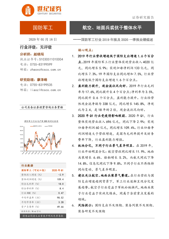 【世纪证券】【20200518】国防军工行业2020年报及一季报业绩综述:航空、地面兵装优于整体水平-22页