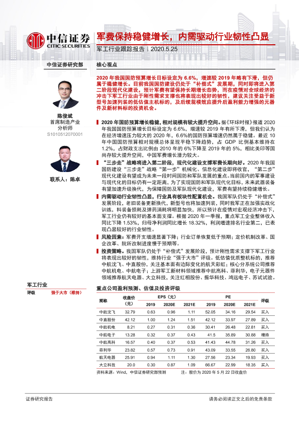 【中信证券】【20200525】20200525-中信证券-军工行业跟踪报告:军费保持稳健增长,内需驱动行业韧性凸显-12页