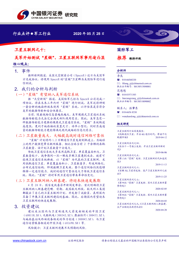 【银河证券】【20200528】军工行业:卫星互联网之十:美军开始测试“星链”,卫星互联网军事用途凸显-4页