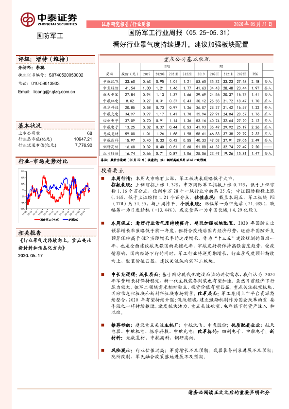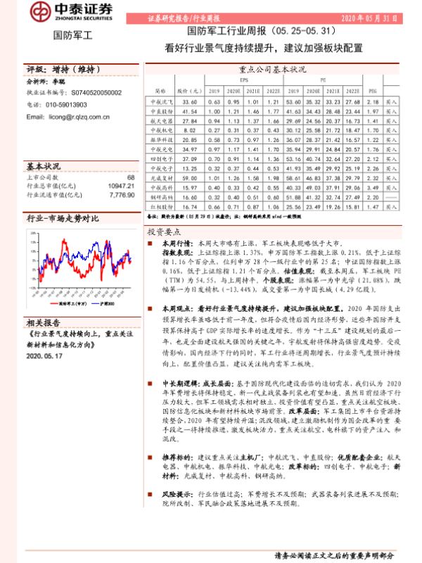 【中泰证券】【20200531】20200531-中泰证券-国防军工行业周报:看好行业景气度持续提升,建议加强板块配置-14页