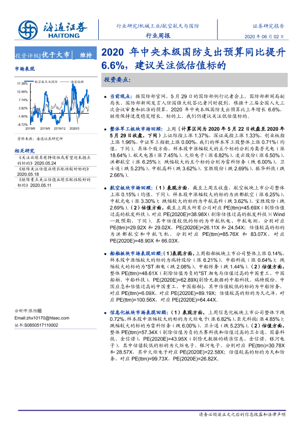 【海通证券】【20200602】2020年中央本级国防支出预算同比提升6.6%,建议关注低估值标的-4页