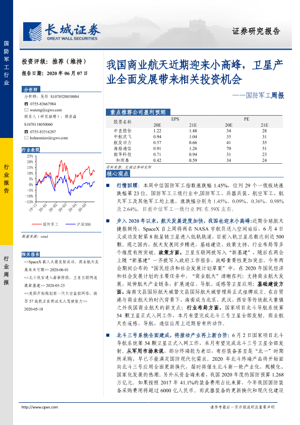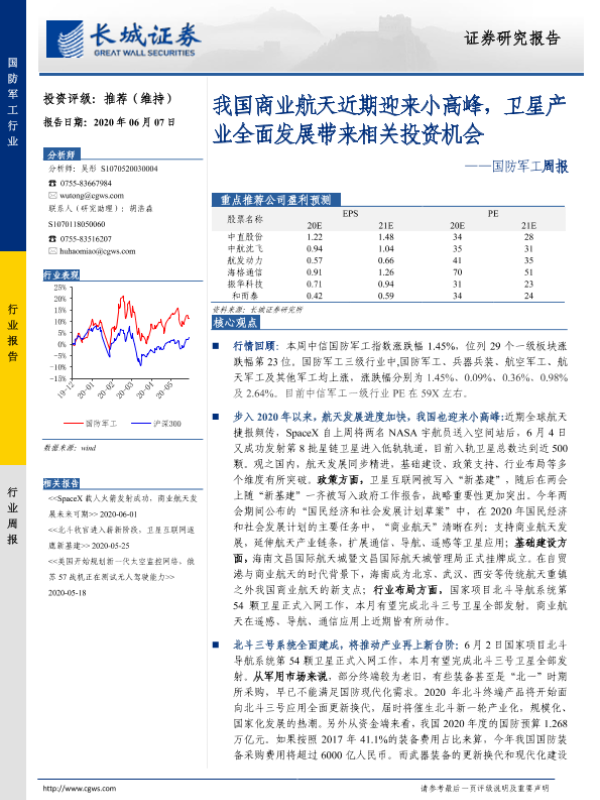 【长城证券】【20200607】20200607-长城证券-国防军工周报:我国商业航天近期迎来小高峰,卫星产业全面发展带来相关投资机会-18页