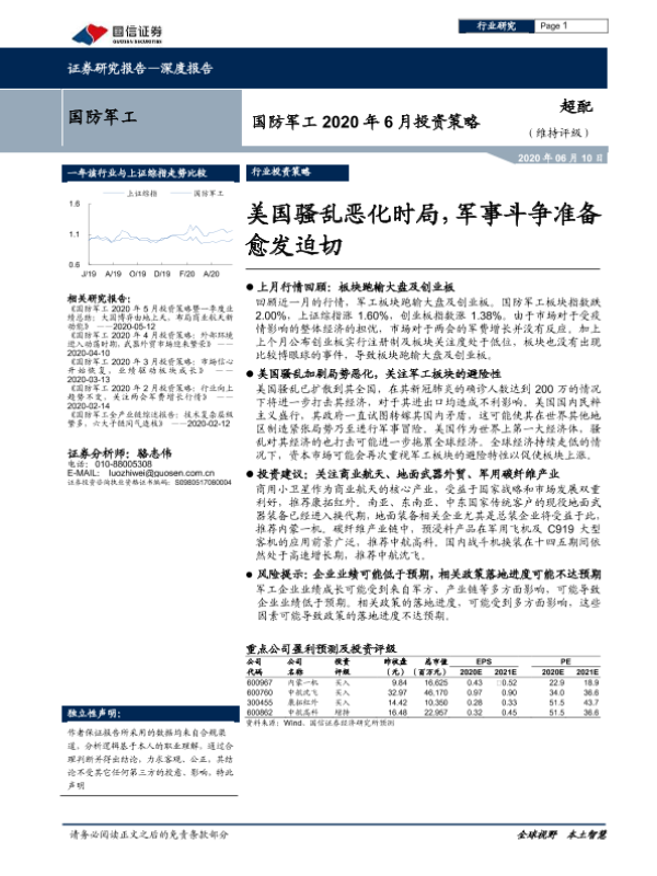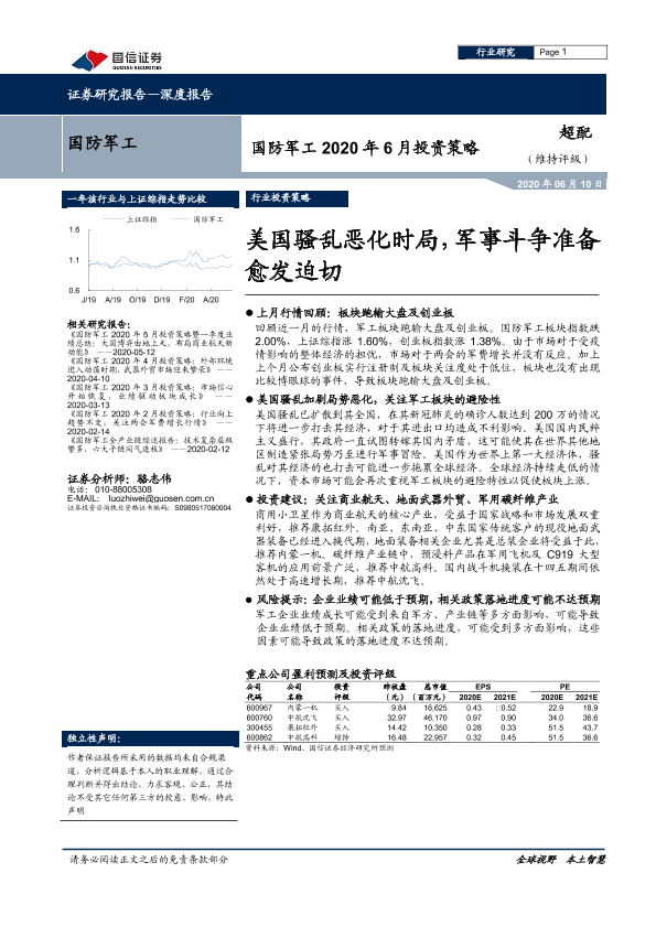 【国信证券】【20200610】国防军工2020年6月投资策略:美国骚乱恶化时局,军事斗争准备愈发迫切-11页