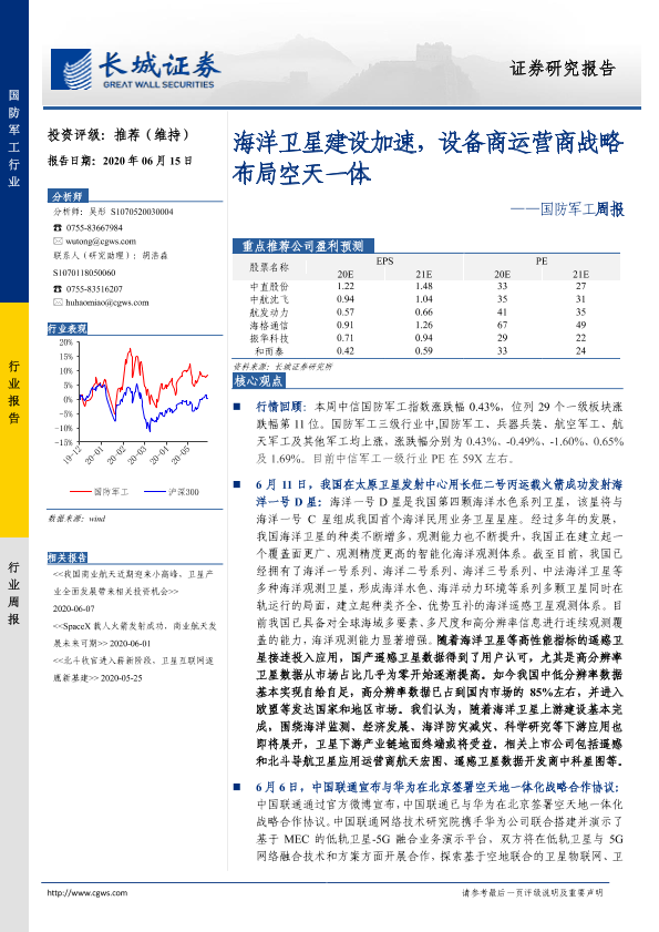 【长城证券】【20200615】20200615-长城证券-国防军工周报:海洋卫星建设加速,设备商运营商战略布局空天一体-20页