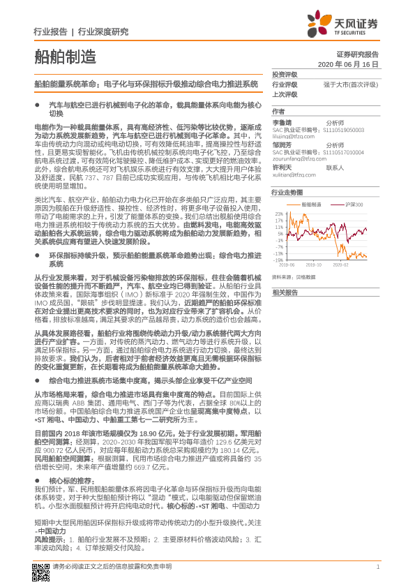 【天风证券】【20200616】船舶制造行业深度研究:船舶能量系统革命:电子化与环保指标升级推动综合电力推进系统-14页