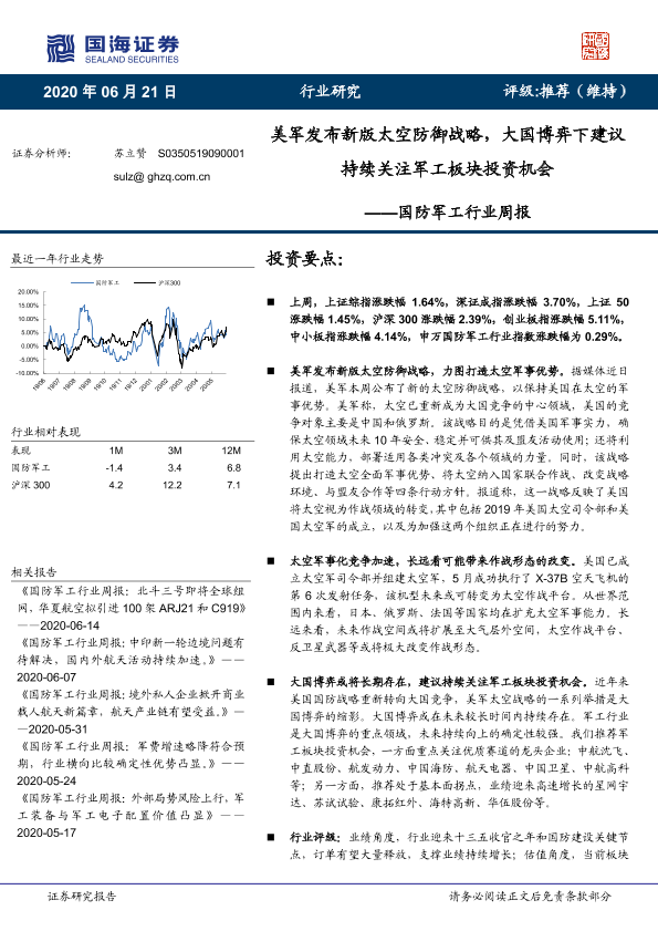 【国海证券】【20200621】国防军工行业周报:美军发布新版太空防御战略,大国博弈下建议持续关注军工板块投资机会-13页