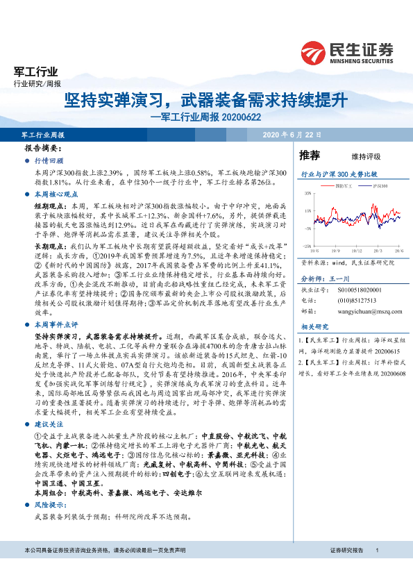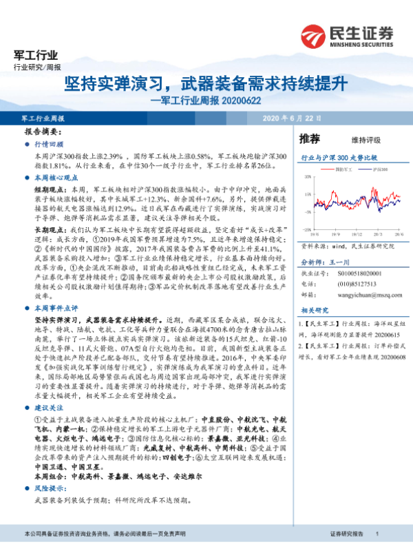 【民生证券】【20200622】20200621-民生证券-军工行业周报:坚持实弹演习,武器装备需求持续提升-41页