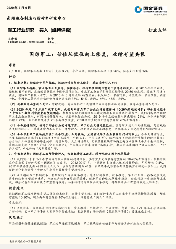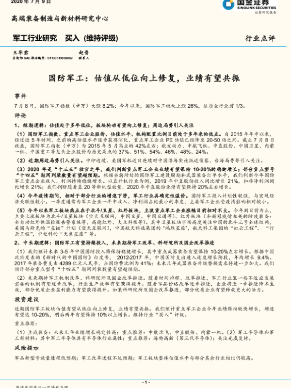 【国金证券】【20200709】军工行业研究:估值从低位向上修复,业绩有望共振-3页