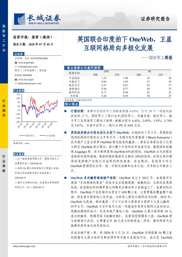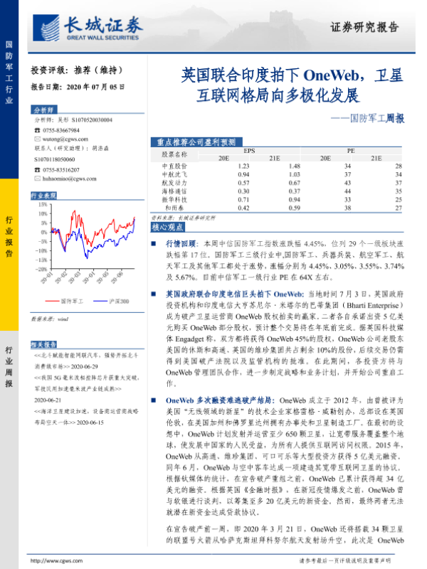 【长城证券】【20200705】20200705-长城证券-国防军工周报:英国联合印度拍下OneWeb,卫星互联网格局向多极化发展-20页