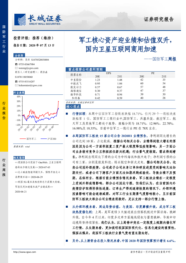 【长城证券】【20200713】20200713-长城证券-国防军工周报:军工核心资产迎业绩和估值双升,国内卫星互联网商用加速-26页