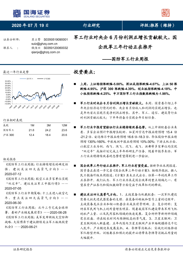 【国海证券】【20200719】20200719-国海证券-国防军工行业周报:军工行业对央企6月份利润正增长贡献较大,国企改革三年行动正在推开-13页