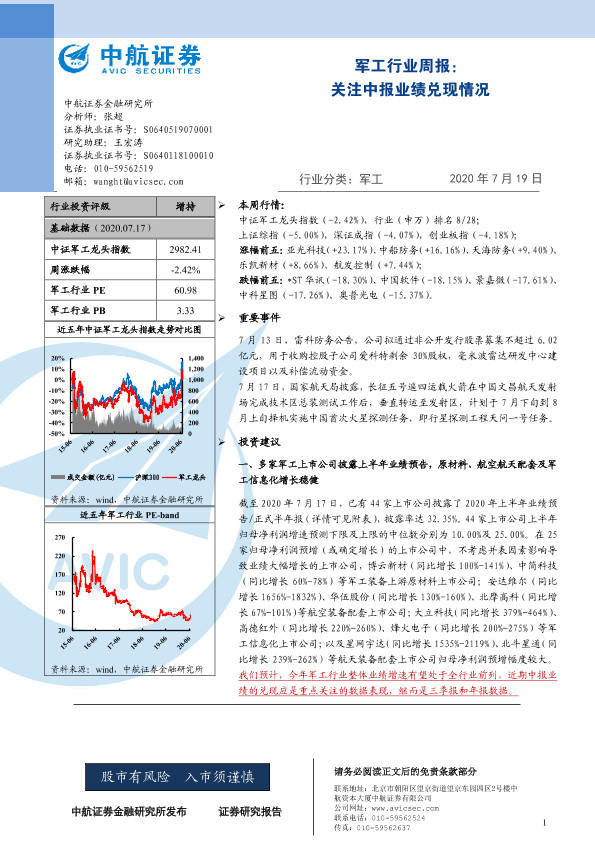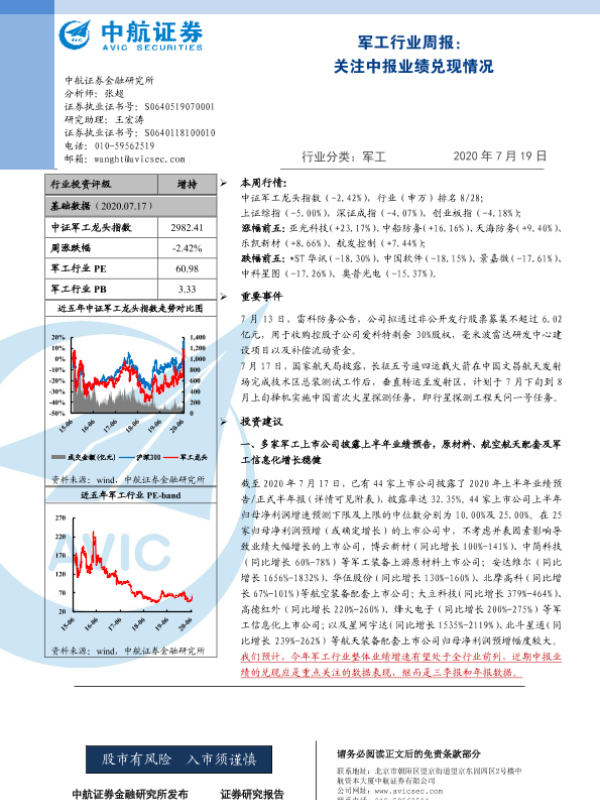 【中航证券】【20200719】军工行业周报:关注中报业绩兑现情况-7页