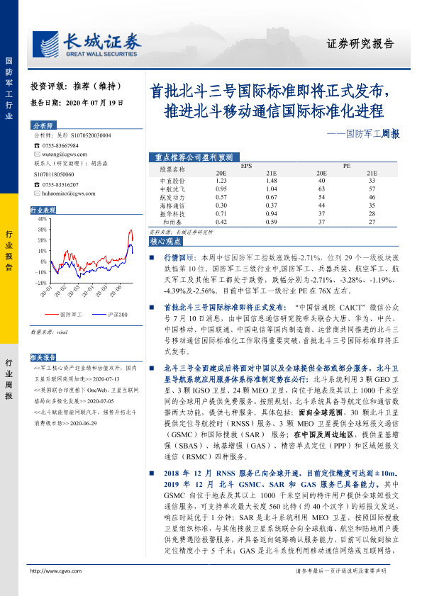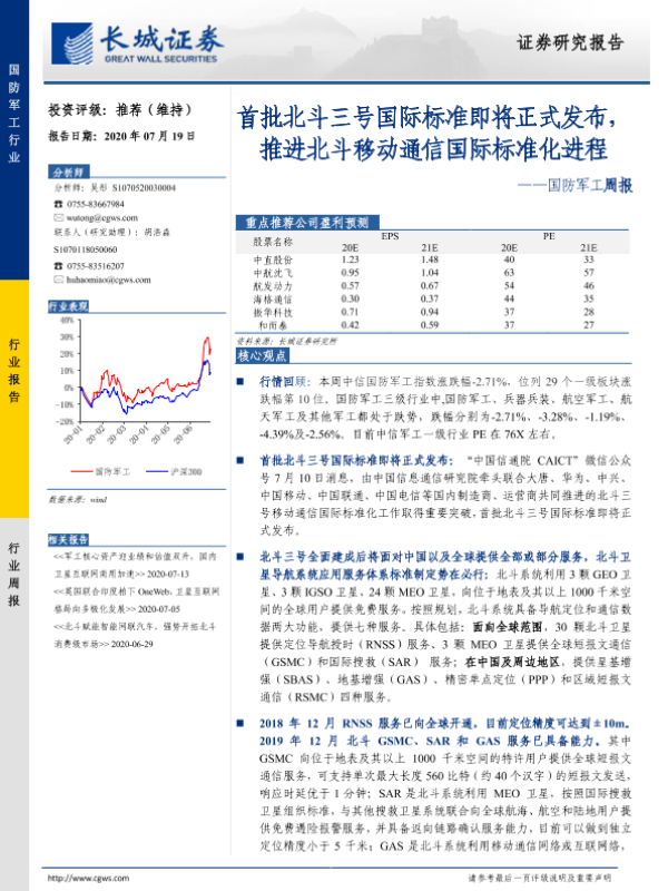 【长城证券】【20200719】20200719-长城证券-国防军工周报:首批北斗三号国际标准即将正式发布,推进北斗移动通信国际标准化进程-19页