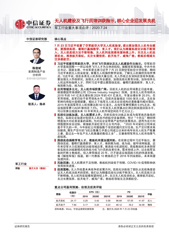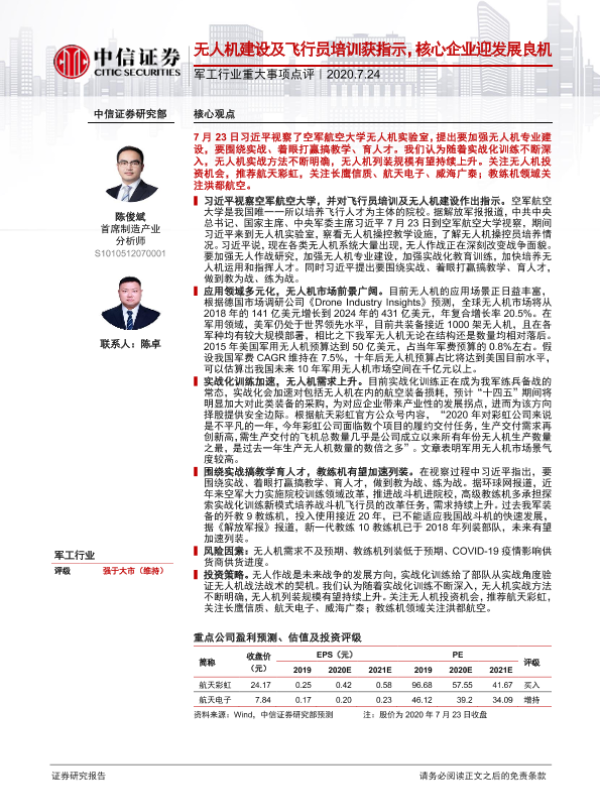 【中信证券】【20200724】军工行业重大事项点评:无人机建设及飞行员培训获指示,核心企业迎发展良机-2页