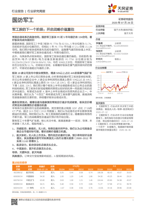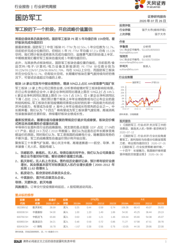 【天风证券】【20200726】国防军工行业研究周报:军工股的下一个阶段:开启战略价值重估-3页
