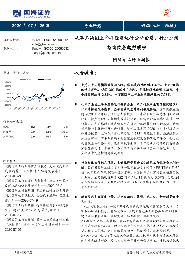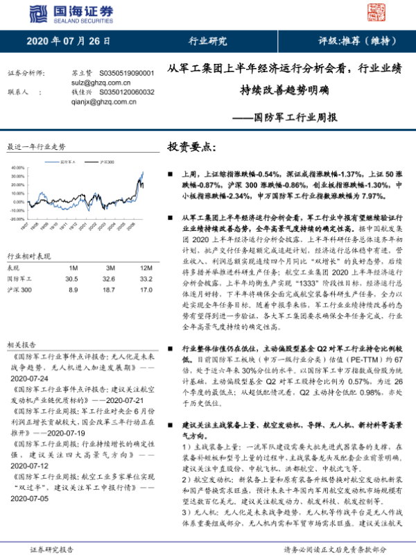 【国海证券】【20200726】20200726-国海证券-国防军工行业周报:从军工集团上半年经济运行分析会看,行业业绩持续改善趋势明确-13页
