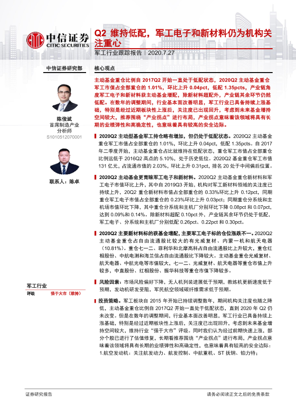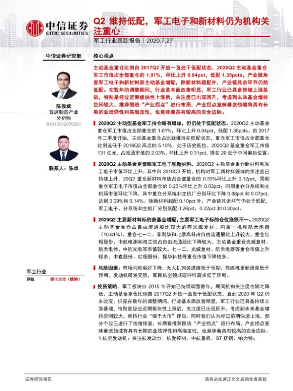 【中信证券】【20200727】20200727-中信证券-军工行业跟踪报告:Q2维持低配,军工电子和新材料仍为机构关注重心-10页