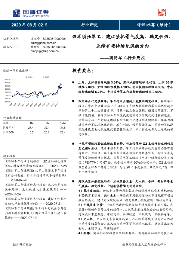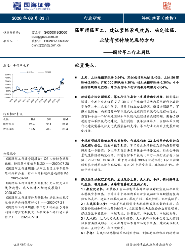 【国海证券】【20200802】20200802-国海证券-国防军工行业周报:强军须强军工,建议紧抓景气度高、确定性强、业绩有望持续兑现的方向-13页